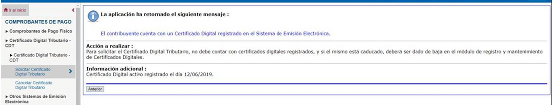 De presentarse el siguiente error en el sistema, corresponde realizar la cancelación del Certificado Digital registrado a fin de solicitar la obtención del Certificado Digital Tributario.