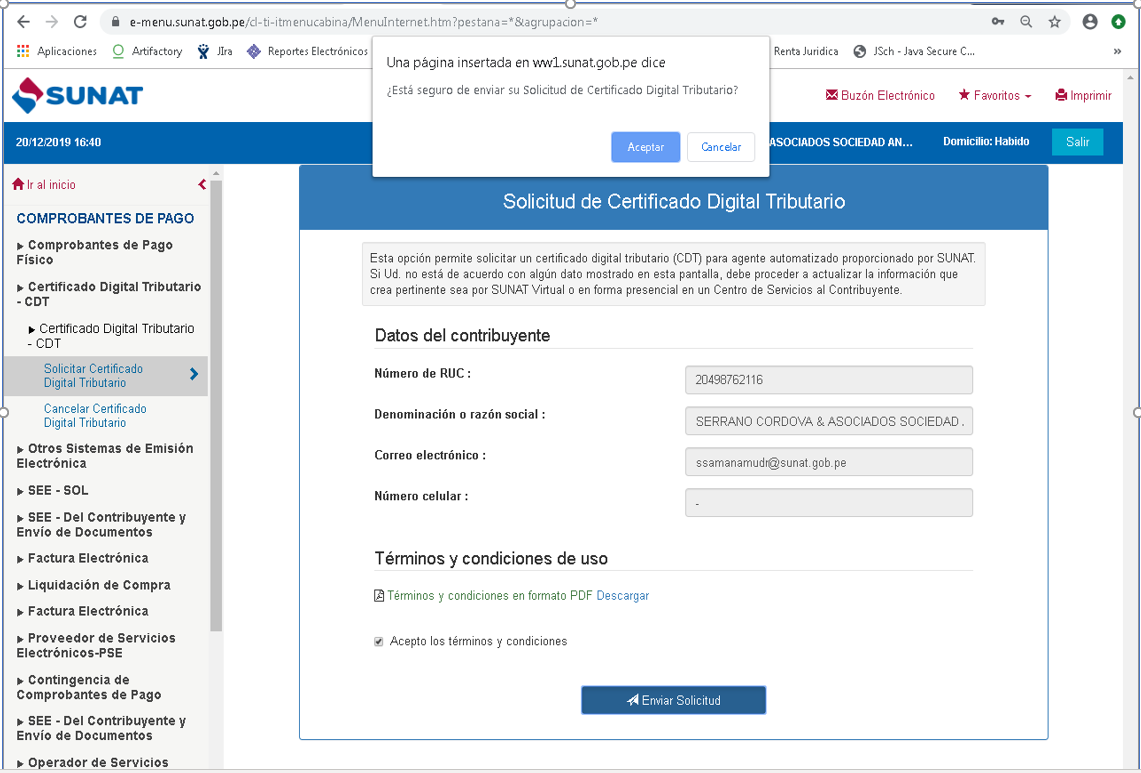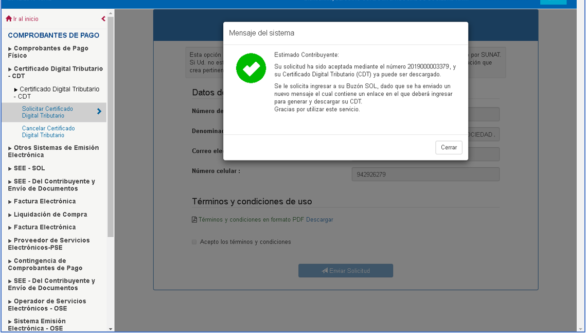 El sistema mostrará una pantalla con la siguiente información del contribuyente, que será enviada a la Entidad de Certificación, además de los términos y condiciones de uso.