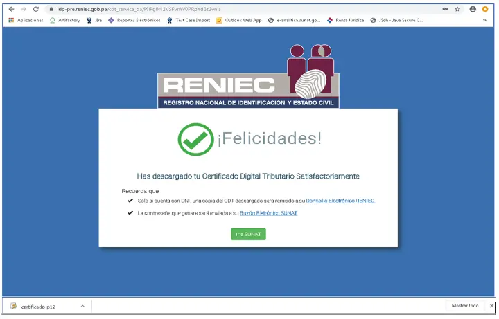 Para terminar con esta funcionalidad, la aplicación le mostrará un mensaje de ¡Felicidades!, con lo cual se culmina la operación del certificado digital tributario.