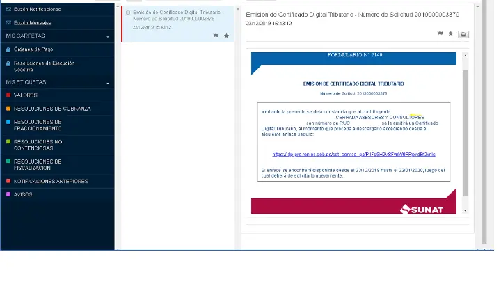 De acuerdo a lo indicado en el mensaje anterior, deberá dirigirse a su Buzón SOL y ubicar el mensaje denominado “Emisión de Certificado Digital Tributario”.