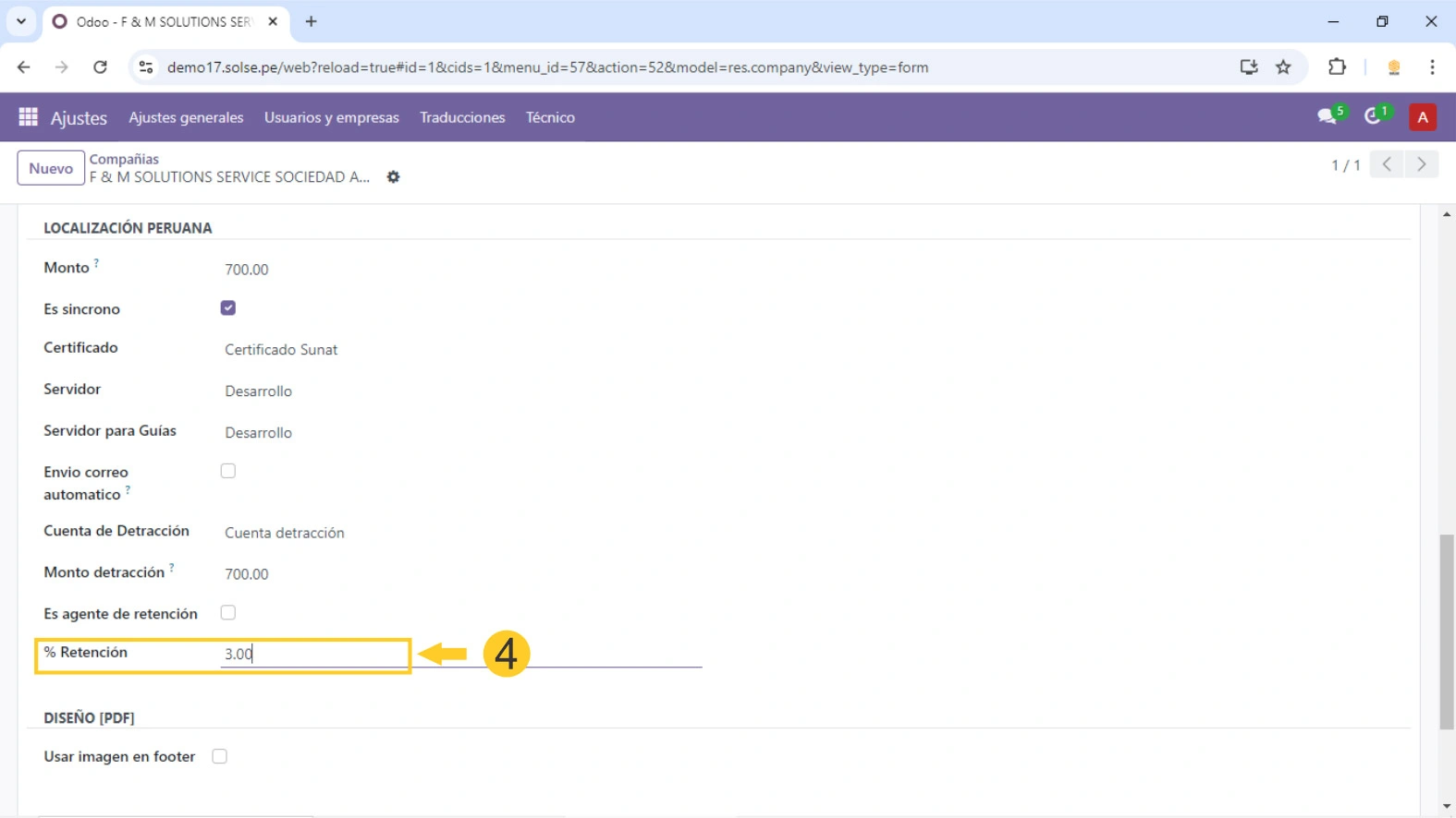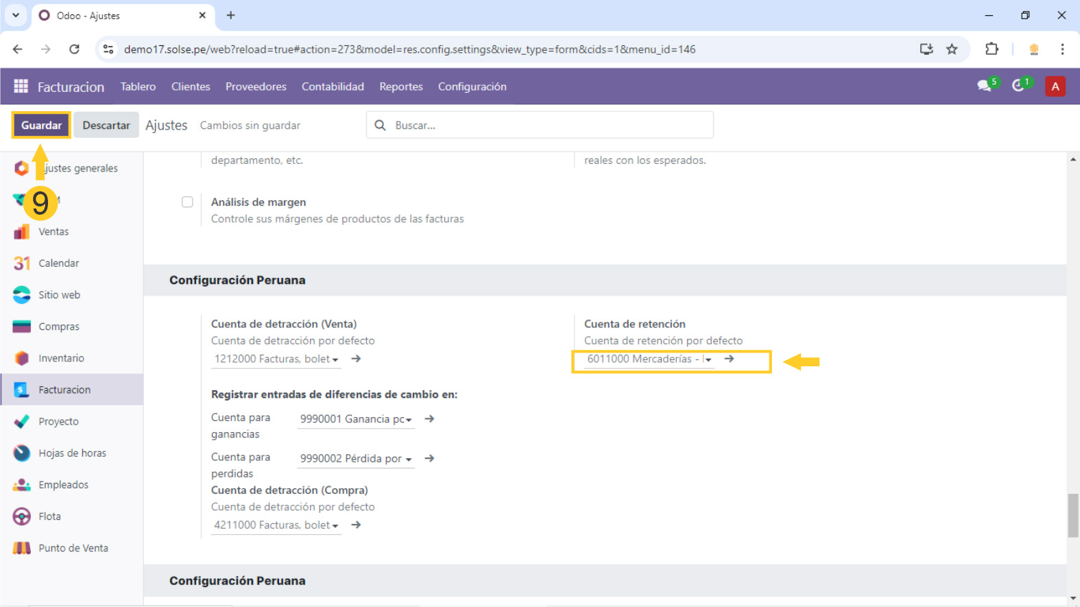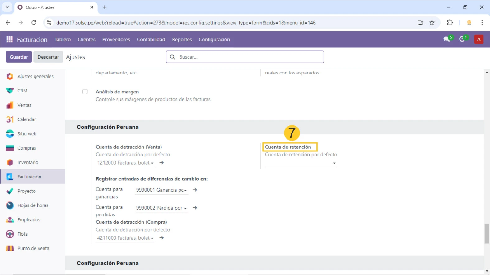 7. Ve a la sección Configuración Peruana y busca el campo Cuenta de Retención.