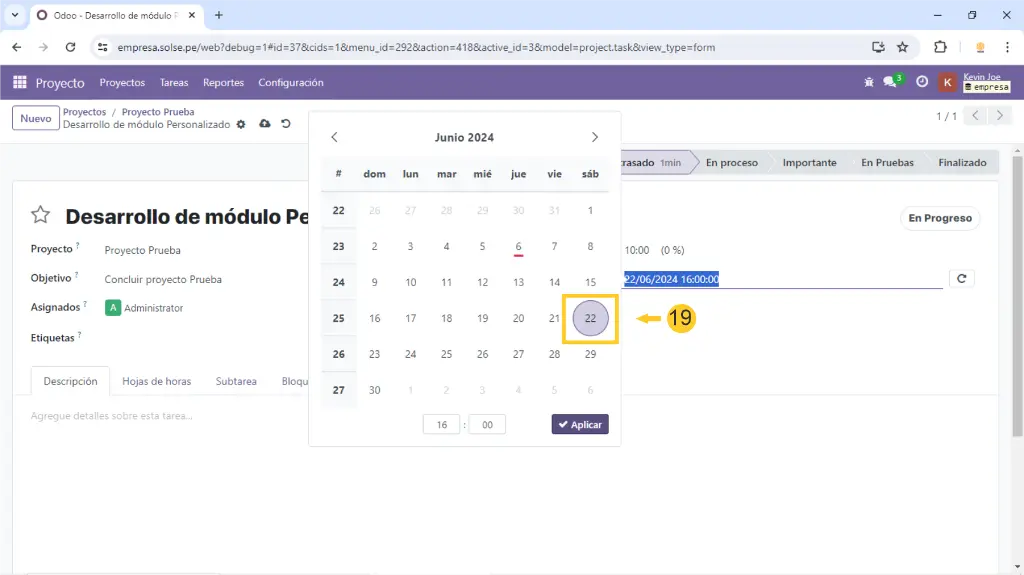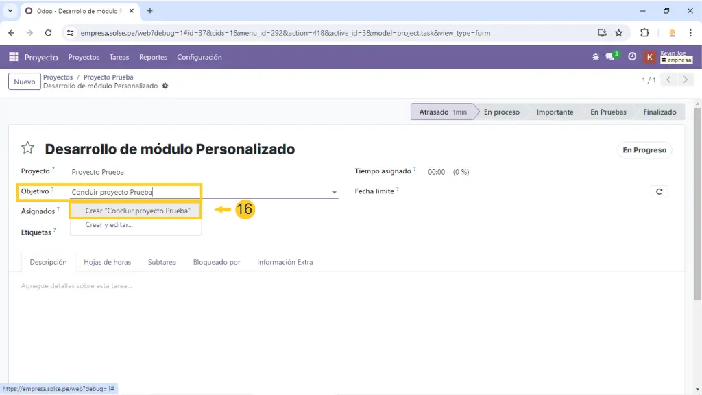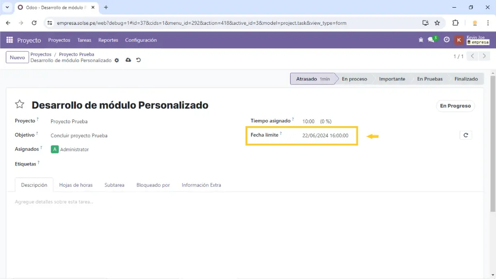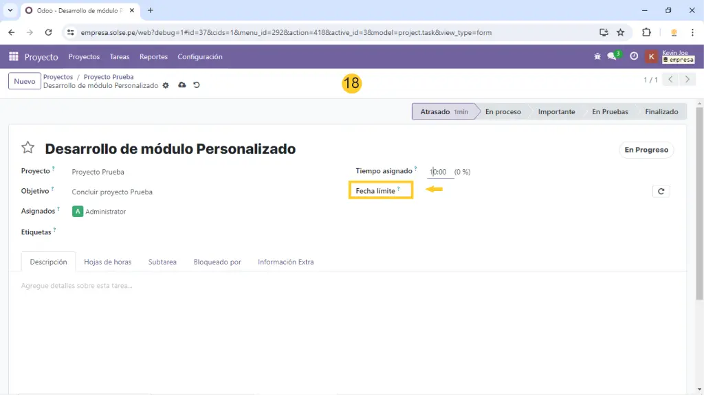 18) En el campo "Fecha Límite", colocamos la fecha que se terminara el proyecto.