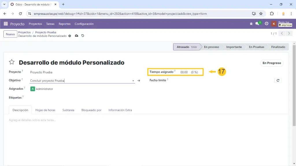17) En el campo tiempo asignado, podemos observar el porcentaje del avance del proyecto.