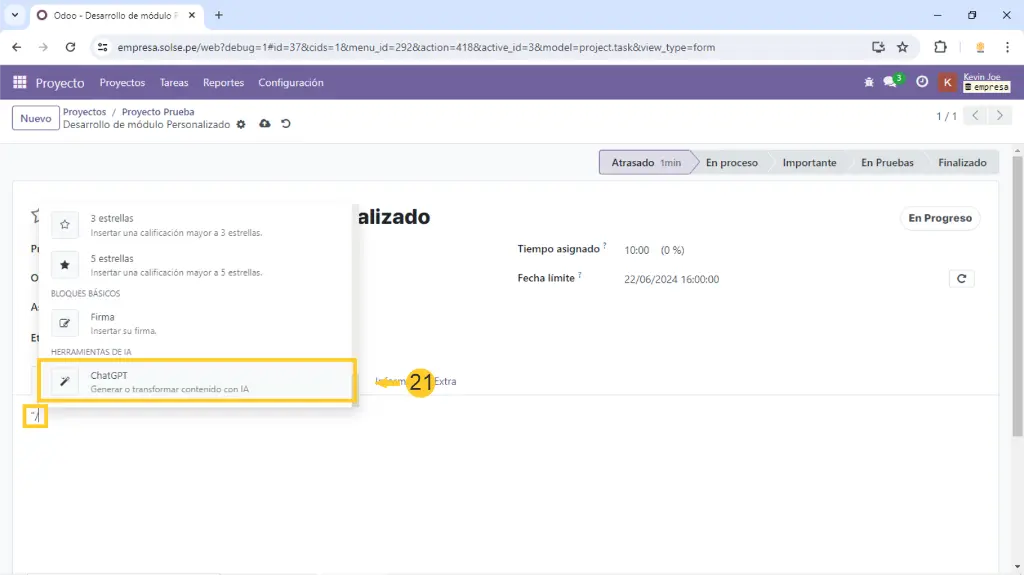 21) Podemos agregar una descripción de la tarea o alguna nota, se puede generar un texto generado por Chat GPT. se coloca ("/) y elegimos ChatGPT.