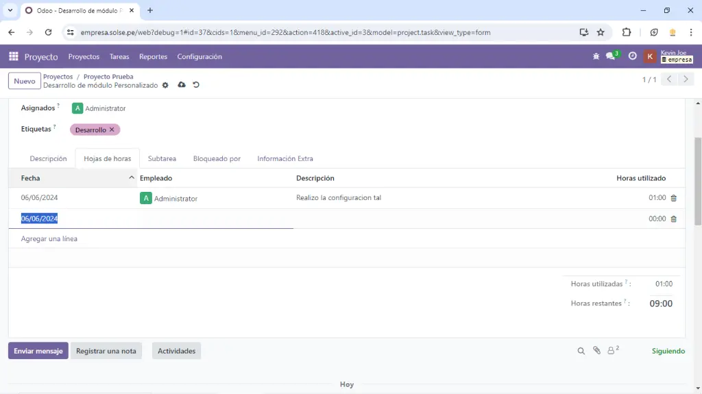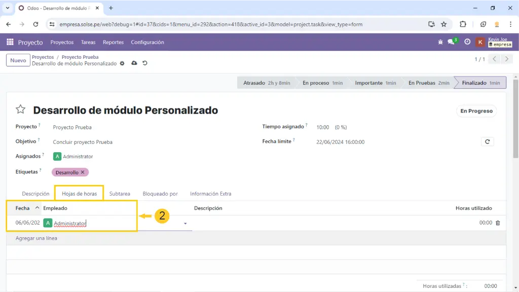 2) Podemos ir a al submenú "Hoja de horas", colocamos la fecha y el empleado.