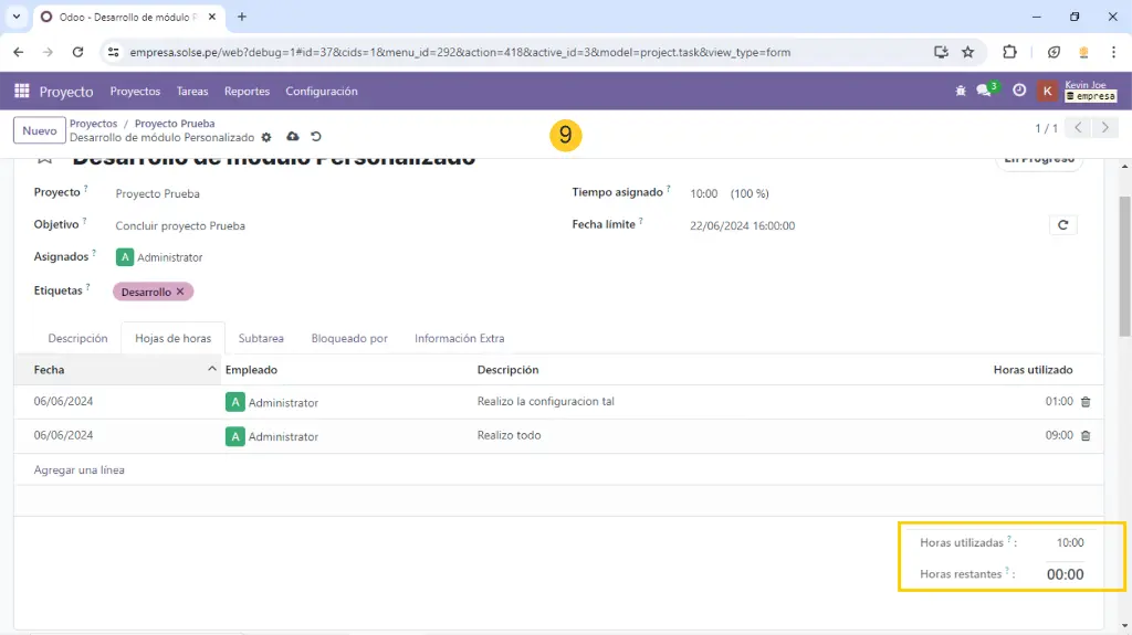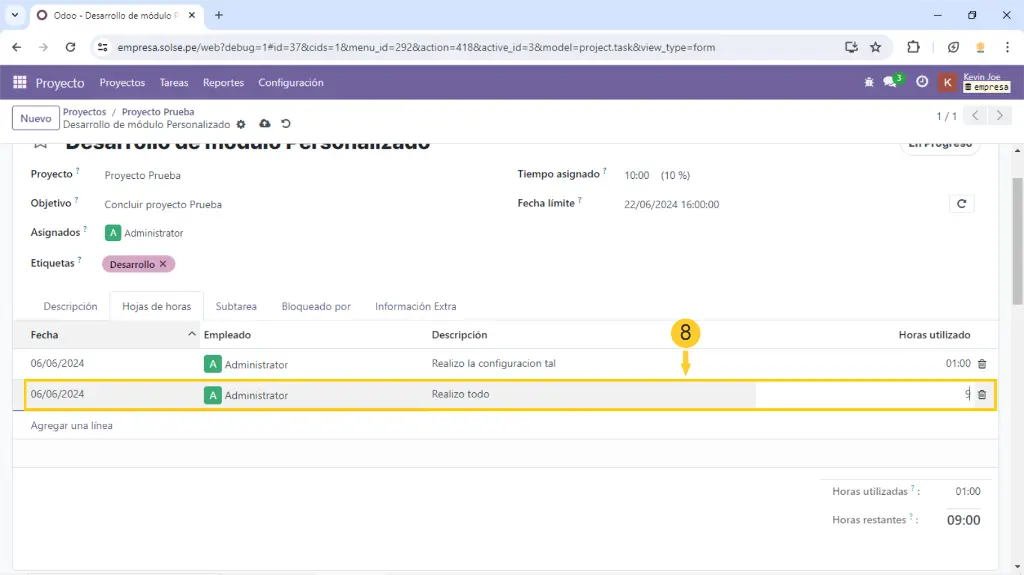 8) Nos sale que nos falta 9 horas para poder acabar la tarea, realizamos otro trabajo y colocamos un trabajo de 9 horas.